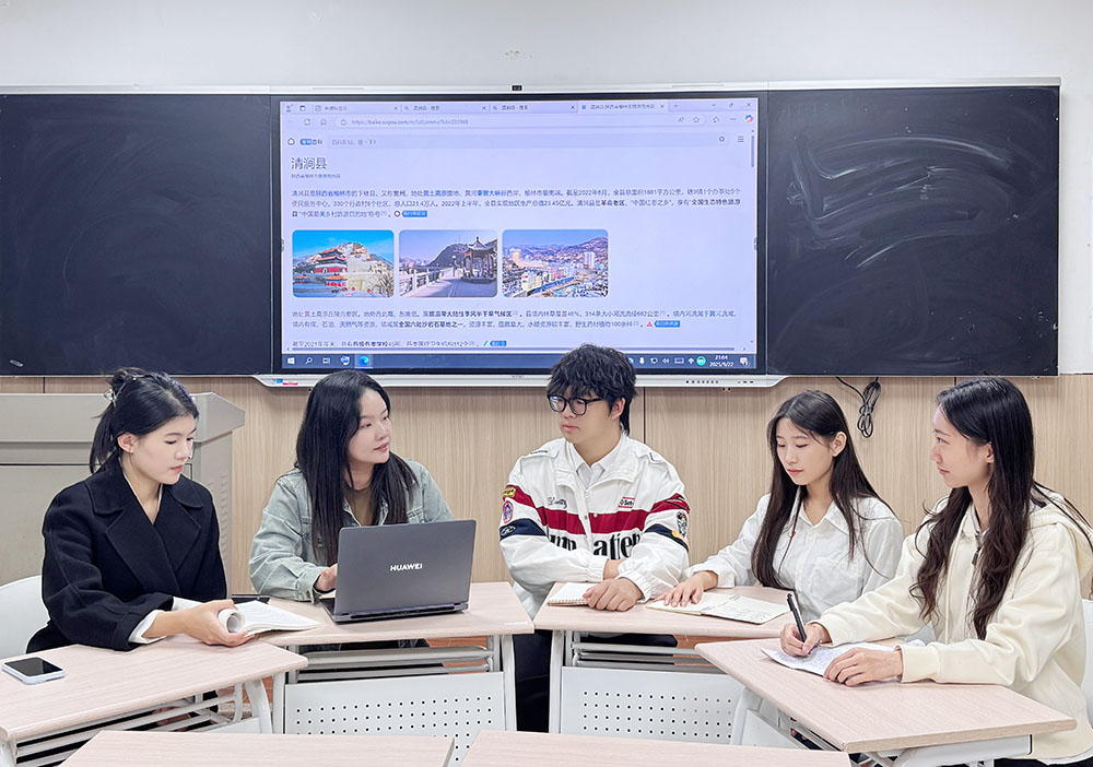 在商学院智慧商务实验实践教学中心,电子商务专业学生崔宇彤正带领团队成员对AI虚拟主播的互动逻辑...