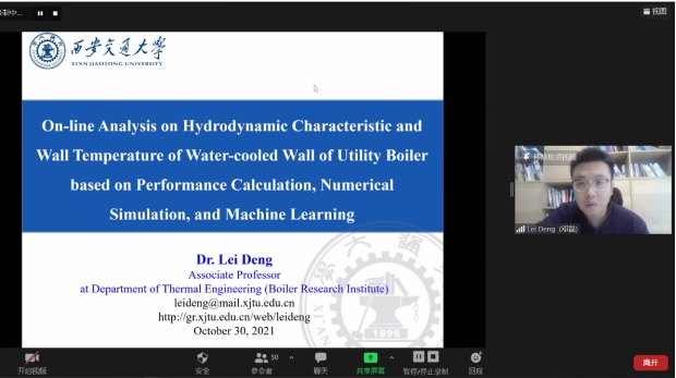 本次会议的主讲嘉宾有秦真鹏(副教授,University of Texas at Dallas,)、史晓军(副教授,西安交通大学)、邓磊(副教授,西安交通大学)。会上,他们分别做了题目为“Micro/Nanoscale Interface with the Brain Using Light and Advanced Nanomaterials”“Research on Thermal Characteristic Analysis and Thermal Error Control of High Speed Precision Machine Tool”“On-line Analysis on Hydrodynamic Characteristic and Wall Temperature of Water-cooled Wall of Utility Boiler based on Performance Calculation, Numerical Simulation, and Machine Learning”的主旨报告。来自安徽工业大学、武汉理工大学等学校的5名专家学者做了口头报告。