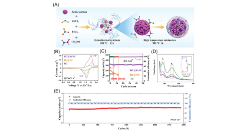 图3. (A) HC@FeNC合成的示意图,作为高效阴极材料用于高性能电解Zn-I₂电池。(B)基于HC@FeNC、HC@NC和HC阳极的Zn-I2电池的循环伏安曲线。