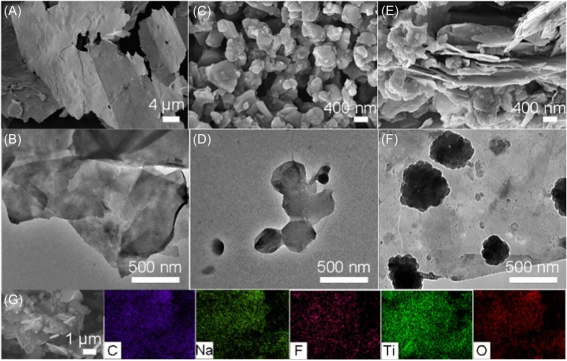 为验证TBC分子与Ti₃C₂Tₓ基底的杂化效果,研究采用场发射扫描电镜(FESEM)和透射电镜(TEM)对样品形貌进行表征。如图2A-B所示,经蚀刻剥离处理的Ti₃C₂Tₓ呈现少层状薄片结构,TEM中观察到的类纸张透明薄片证实其超薄特性,表明材料具有高质量。纯TBC样品(图2C-D)显示300-800 nm的不规则颗粒且存在严重团聚,这种结构在电化学循环中易发生降解。与之形成鲜明对比的是,Ti₃C₂Tₓ MXene负载的TBC分子在其表面和层间呈现均匀连续分布(图2E-F)。这种紧密的界面接触有利于电子传输和离子扩散。元素分布图(图2G)显示C、Na、F、Ti、O元素在TBC/Ti₃C₂Tₓ中均匀分布,证实TBC分子成功锚定在Ti₃C₂Tₓ表面并形成明确界面。值得注意的是,具有高电负性的F、O元素的存在更有利于Na⁺吸附,从而显著提升电极材料的储钠活性。