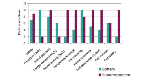 如图1所示,电池与超级电容器的对比表明两种技术各有优劣。因此,混合使用这些系统可融合双方优势,从而实现更高效的储能解决方案。