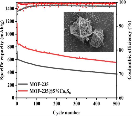 通过合成以Co9S8作为多功能基体的MOF-235@Co9S8复合正极材料,显著提升了锂-硫电池的性能。Co9S8的引入促进了MOF-235的成核,使其粒径减小,比表面积较纯MOF-235增加了76.7%,达到147.6 m²/g。优化的MOF-235@5%Co9S8/S复合材料在0.5C倍率下展现出859.3 mAh/g的高初始放电容量,经500次循环后仍保留556.4 mAh/g,容量保持率达64.7%,远超纯MOF-235/S的性能。这种性能提升源于Co9S8的协同效应:它显著提高了导电性和锂离子扩散能力,通过极性的Co─S键将多硫化物化学锚定以抑制穿梭效应,并催化加速了多硫化物的转化动力学。该复合材料在具有长循环稳定性的高性能锂-硫电池应用方面展现出巨大潜力。