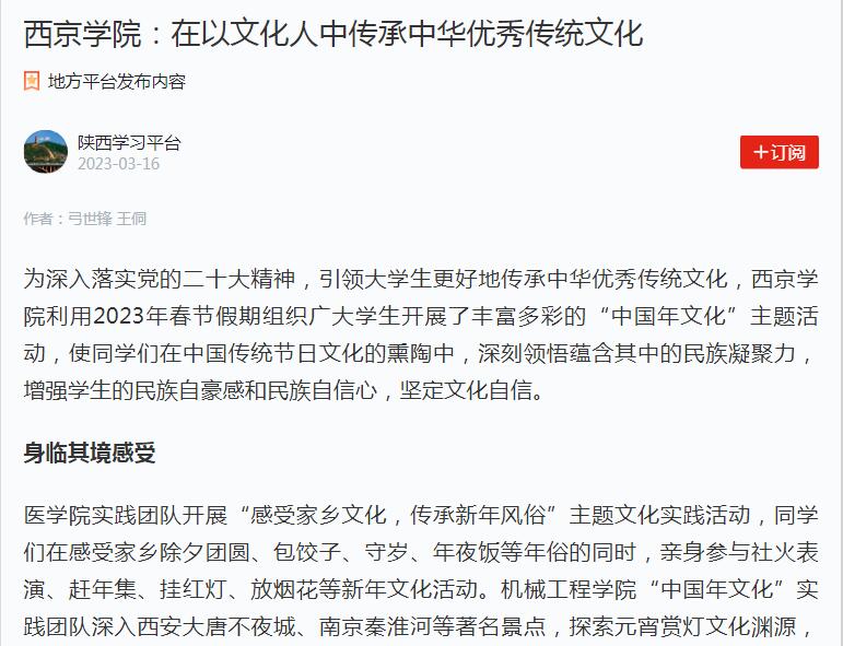 为深入落实党的二十大精神,引领大学生更好地传承中华优秀传统文化,西京学院利用2023年春节假期组织广大学生开展了丰富多彩的“中国年文化”主题活动,使同学们在中国传统节日文化的熏陶中,深刻领悟蕴含其中的民族凝聚力,增强学生的民族自豪感和民族自信心,坚定文化自信。
