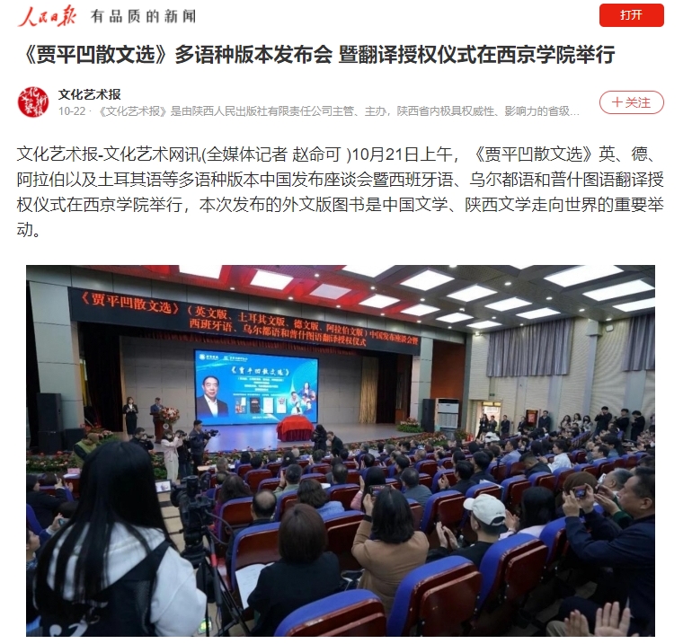 10月21日上午,《贾平凹散文选》(英文版、土耳其文版、德文版、阿拉伯文版)中国发布座谈会暨西班牙语、乌尔都语和普什图语翻译授权仪式在西京学院举行,本次发布的外文版图书旨在贯彻落实习近平总书记对宣传思想文化工作作出重要指示,是中国文学、陕西文学走向世界的重要举动。
