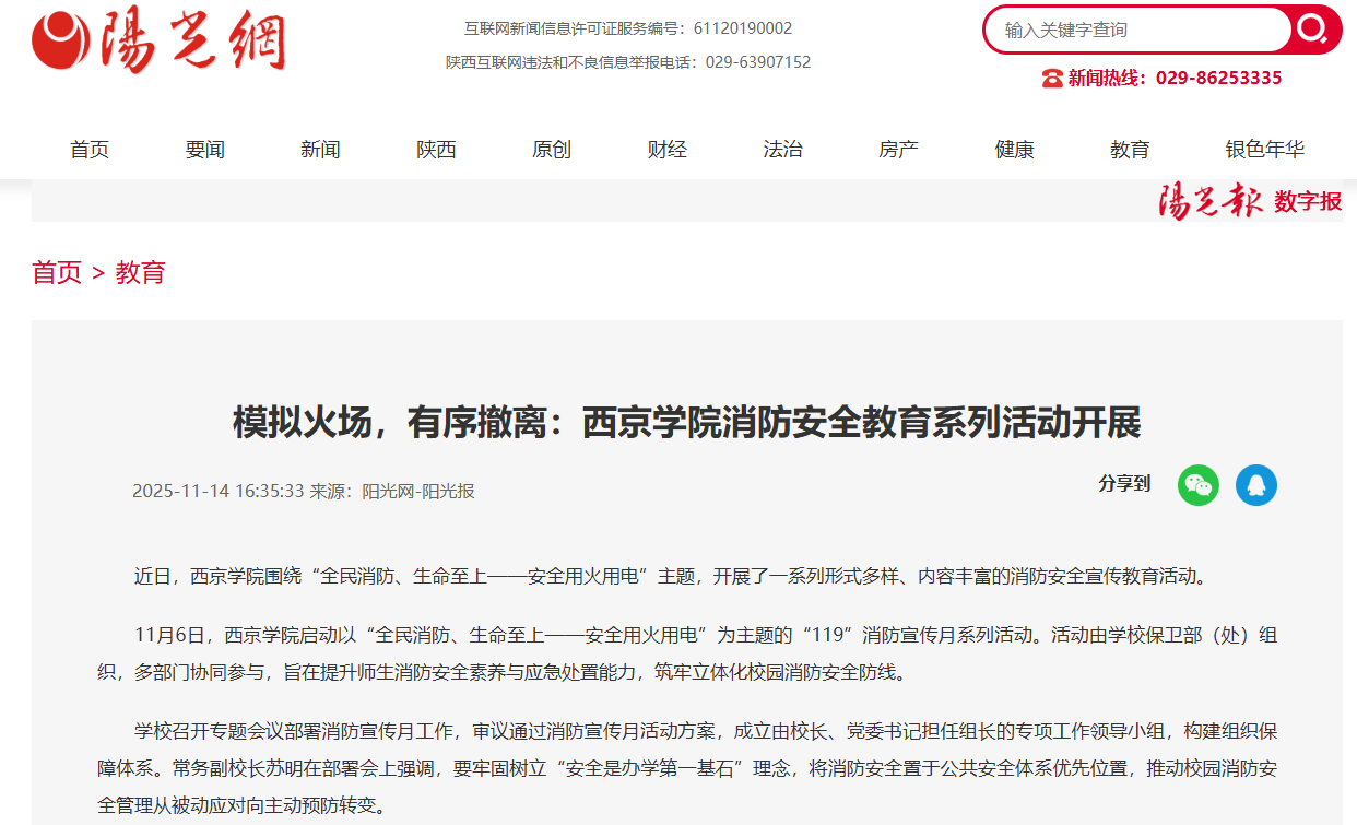 11月6日,西京学院启动以“全民消防、生命至上——安全用火用电”为主题的“119”消防宣传月系列活动。活动由学校保卫部(处)组织,多部门协同参与,旨在提升师生消防安全素养与应急处置能力,筑牢立体化校园消防安全防线。