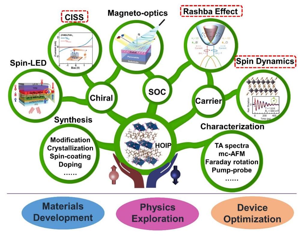 该综述文章集中讨论了基于自旋轨道耦合(SOC)的自旋电子现象,尤其是Rashba分裂及其在自旋-电荷转换中的应用。文章特别强调了HOIPs中的手性-自旋耦合,这一特性在非中心对称HOIPs中表现得尤为明显,包括手性诱导的自旋选择性(CISS)。此外,HOIPs的复杂能带结构和载流子/激子特性,使得自旋动力学成为研究的核心。