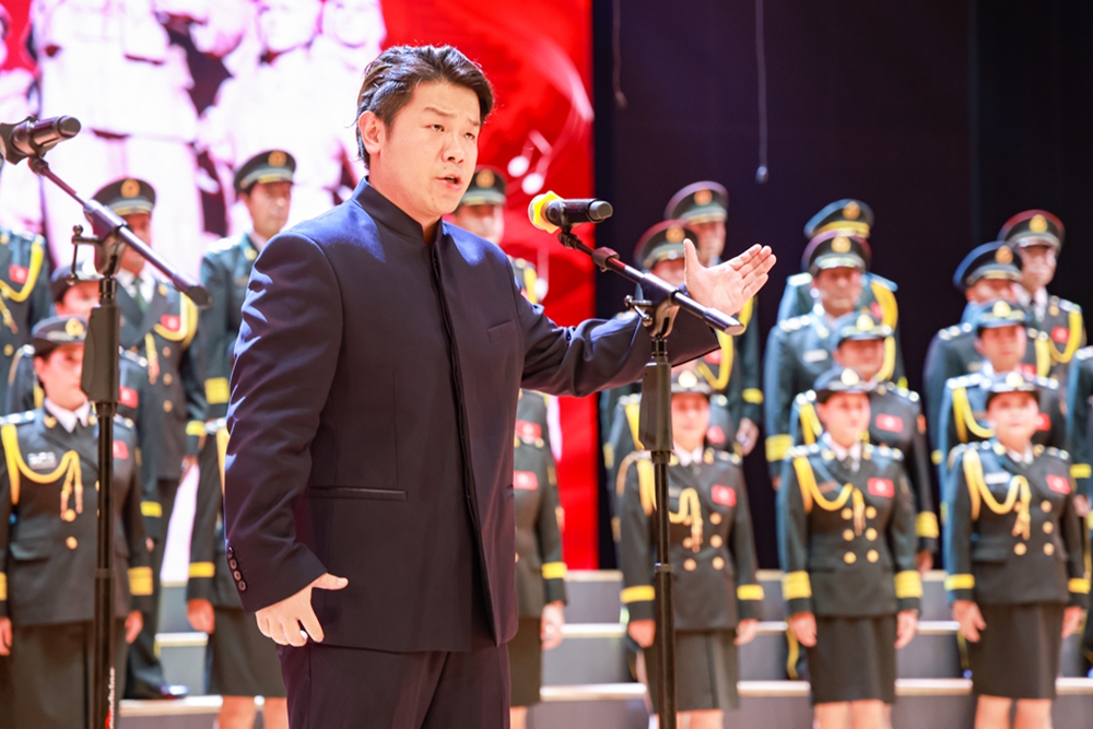第二部分“长征”,由军之韵合唱团倾情演绎《长征组歌》,在青年指挥家王开的指挥下,合唱团成员身着军礼服,军功章熠熠生辉,他们以铿锵的歌声将长征的每一段历程都演绎得惟妙惟肖。我校的马进、李文琛、韩晓东老师还与军之韵合唱团合作,在《长征组歌》中担任部分曲目的领唱。