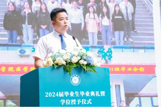 “人生相遇又别离,岁月不居,时节如流,只愿你不忘少年时,坦荡而无畏。”教师代表电子信息学院李鹏在致辞中分享了作为辅导员与同学们相处的难忘时刻,“我很庆幸也很幸福,融入你们的青春故事。如今的你们已褪去了青涩变得自信而从容,大家的每一点进步,都让老师感到无比的欣慰和骄傲。”对于将离开校园,扬帆起航的“孩子们”,他希望同学们初心不改,带着梦想继续远航,“未来不论是惊涛骇浪还是晴空万里,你的母校和老师都会关注你、祝福你,记着常回家看看,期待着你们捷报频传!”