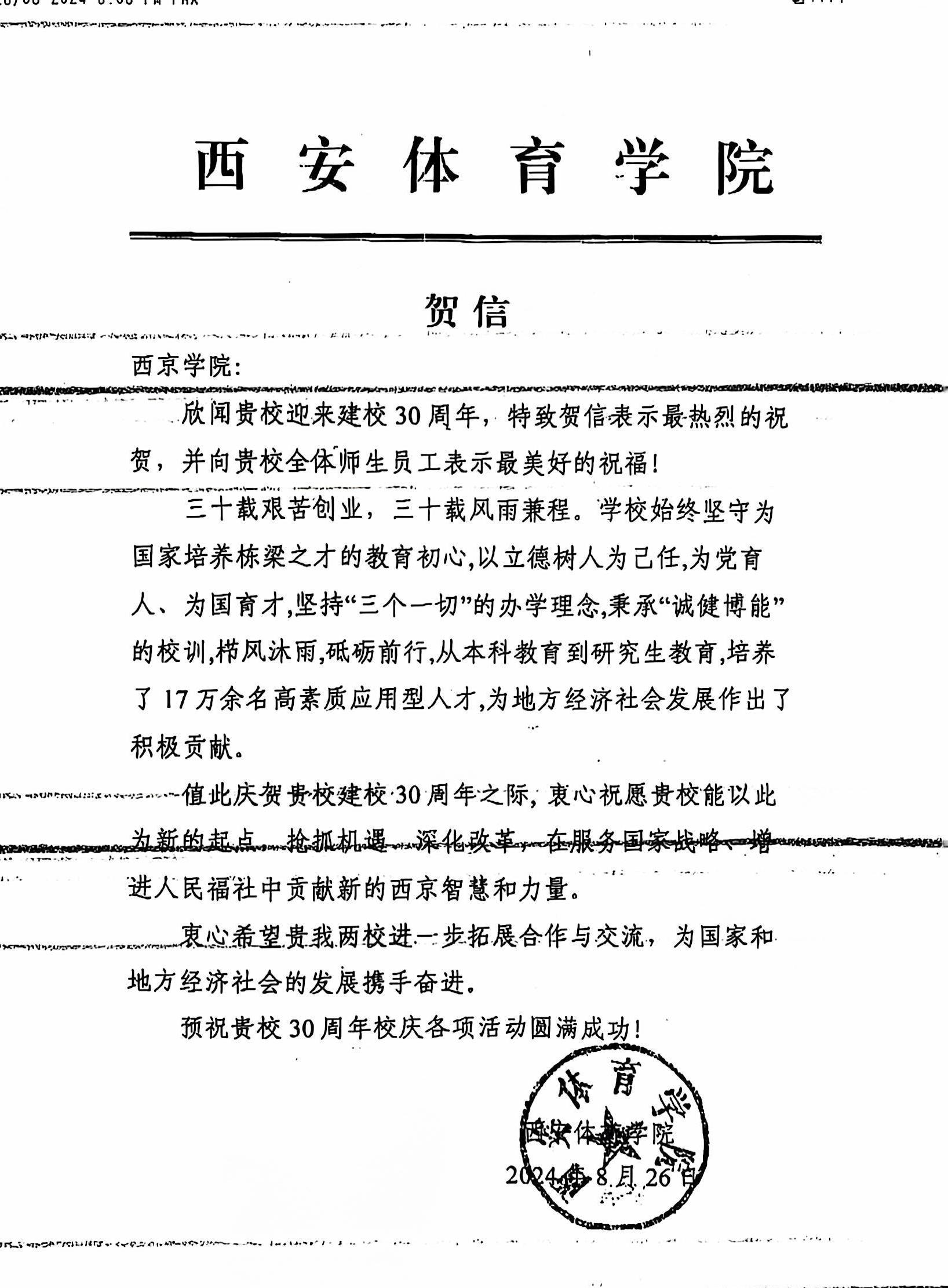 西京学院建校三十周年之际,百所国内外友好合作高等院校陆续发来贺信,借由书信祝福西京学院越办越好,表达深化合作、携手共进,共同为建设教育强国贡献力量的美好愿景。