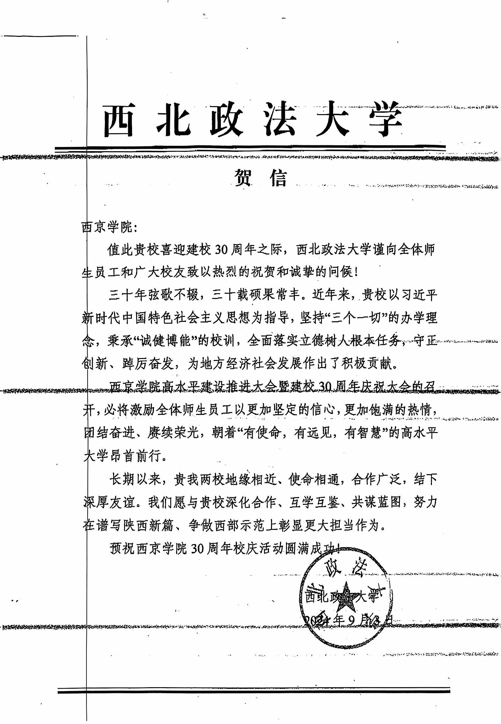 西京学院建校三十周年之际,百所国内外友好合作高等院校陆续发来贺信,借由书信祝福西京学院越办越好,表达深化合作、携手共进,共同为建设教育强国贡献力量的美好愿景。