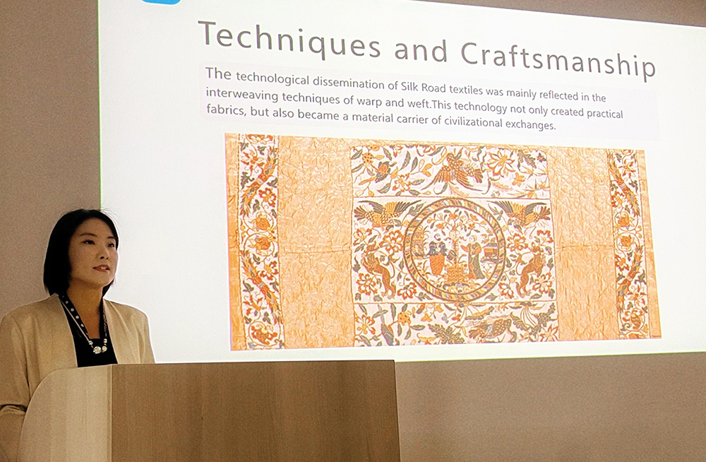 Session:The Silk Road: a corridor of innovation, civilization, migration, culture, art, science, technology, environmental and climate change(大会主题为丝绸之路:人口迁徙、文化艺术、科学技术、文明创新和气候环境变化的走廊),杨燕老师进行了Interwoven Warp and Weft: The Dual-Track Transmission of Technology and Symbols in Silk Road Textile Patterns and Civilizational Mutual Learning(经纬交织:丝绸之路纺织图案中技术与符号的双轨传播及文明互鉴)的论文发言。