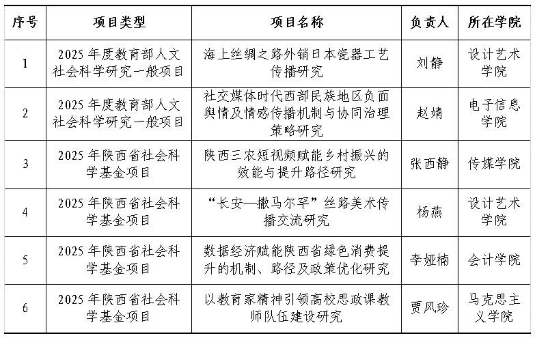 西京网讯:近日,教育部社会科学司与陕西省哲学社会科学工作办公室相继公布2025年度教育部人文社会科学研究一般项目与陕西省社科基金项目立项结果,我校科研工作再传捷报:教育部人文社会科学研究一般项目获批2项,陕西省社科基金项目获批4项,立项数量与质量同步攀升。