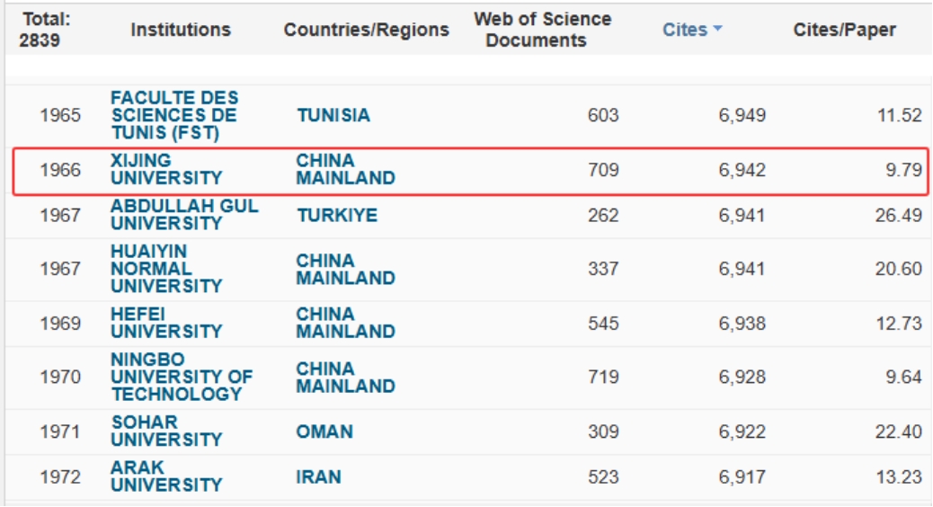 从论文发表与引用情况来看,本期西京学院被ESI数据库收录的论文共计2451篇,总被引频次为27225次。其中,高被引论文44篇,热点论文6篇。丰富的论文产出和较高的被引频次,充分体现了学校科研成果的质量和学术价值得到了国际学术界的广泛认可。