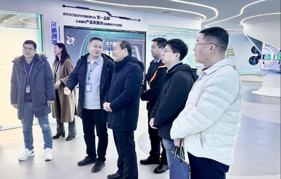 在华天科技(西安)公司招聘主管冯军波陪同下,郭建新一行参观了企业现代化展厅。冯军波介绍了华天科技的发展历程、产业布局及在集成电路封装测试领域的技术成果。