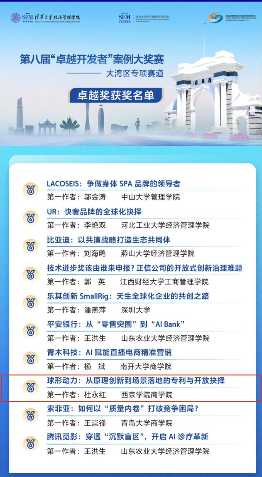 西京网讯:1月5日,中国工商管理案例中心公布了第八届“卓越开发者”案例大奖赛的一、二等奖获奖名单。我校商学院杜永红教授、唐树艺老师与深圳球形动力科技有限公司联合开发的教学案例《球形动力:从原理创新到场景落地的专利与开放抉择》脱颖而出,获大湾区专项赛道“卓越奖”,并入选中国工商管理案例库。