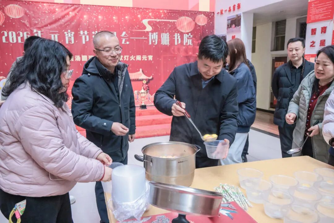 夜幕降临,社区楼宇长廊被一盏盏花灯点亮。猜灯谜区域,同学们三五成群,在悬挂的谜语前驻足讨论、推敲答案,现场不时传出会心的笑声。与此同时,师生们还围坐在一起,共同煮制、品尝元宵,在氤氲的热气中感受团圆的氛围。