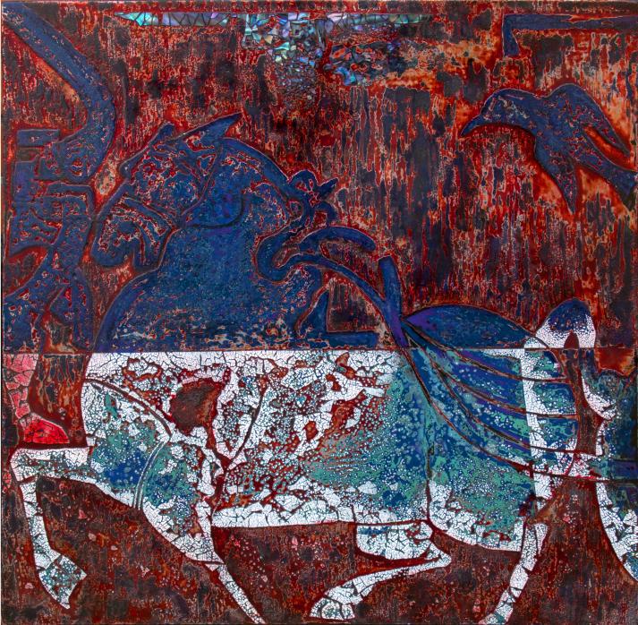 作品简介:《影色》将中国传统皮影戏与漆画相融合,此作品巧妙地呈现了皮影人物的生动形象与戏剧性场景,运用大漆起皱、贴金银箔等传统漆画技法,绘制打磨而成,整体具有浓烈的中国风气息,同时保留了漆画独有的光泽与古朴质感。在这幅作品中,不仅展现了皮影戏的古朴韵味,还赋予了传统艺术以现代感,让古老的文化在独特的漆画形式中焕发新生。