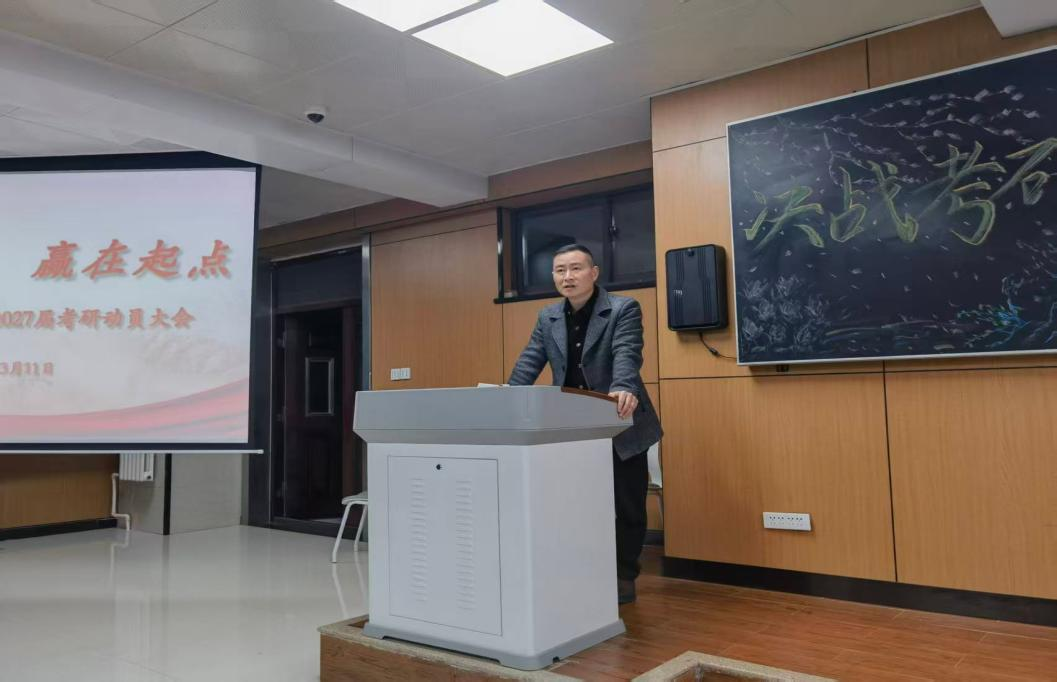 大会伊始,段领主任就学院考研班组建背景、建设目标与支持保障做详细说明。他表示,学院成立考研班,旨在为备考学生提供固定学习场所、优质学习资源与浓厚学习氛围,构建目标一致、互帮互助、共同进步的备考共同体。他希望同学们珍惜平台、把握机遇,以坚定信念与扎实行动投入复习,在集体助力下实现考研目标。