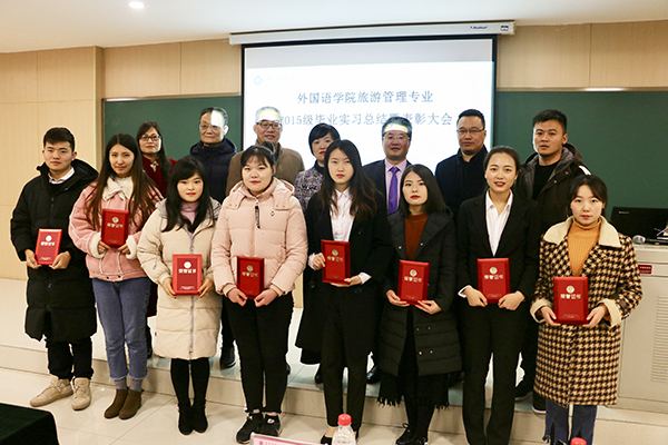 12月12日,2015级旅游管理专业毕业顶岗实习总结暨表彰大会在图书馆101报告厅举行。教务处处长肖建军、教学质量监督处副处长鲁进步、外国语学院院长谢俊平、旅游与酒店管理专业负责人丁爱芹、旅游与酒店管理专业全体老师及百余名学生参加了大会,苏州W酒店人力资源总监朱琦、上海轩旭酒店管理公司总经理张加琪、陕西秦旅集团副总经理张嘉泉、导游部经理康超也应邀出席本次会议。大会由外国语学院语言中心主任何虹柳主持。