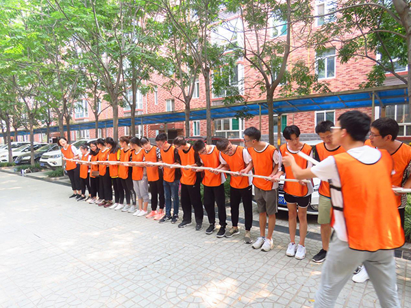 团训教官迅速组织同学们集合列队,紧接着跟同学们介绍了此次团训的课程内容以及训练规则。团训分小组进行,共分为橘、黄、蓝、红、绿5个小组。活动项目由“爱的鼓掌”“极速60秒”“移动高尔夫”“呼吸的力量”“疯狂的市场”“命悬一线”等团队协作游戏组成。